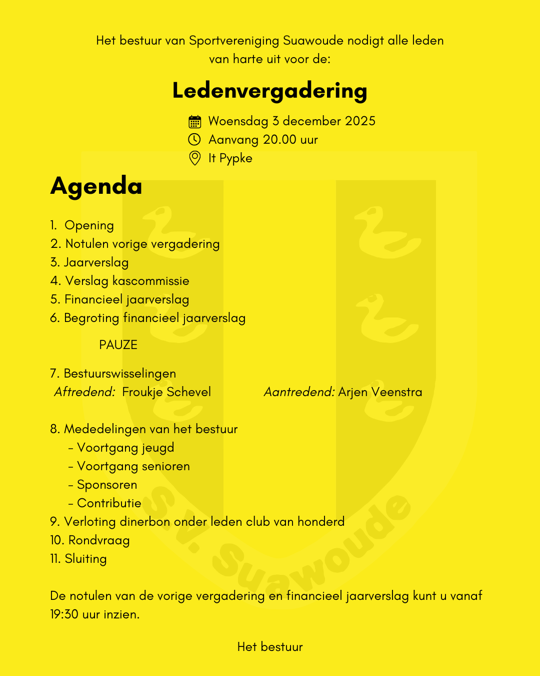Woensdag 3 december is het weer tijd voor onze jaarlijkse ledenvergadering! Om 20:00 uur ben je welkom in it Pypke om mee te praten over de toekomst van de club. Op de agenda staan o.a. bestuurswisselingen, mededelingen van het bestuur en de verloting van een dinerbon onder de leden van de club van honderd. 📊💬